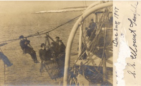 At two o’clock in the morning, Charles Wolfe, a resident of Ironbound, was awakened by his dog Busco’s barking, and the blaring of a horn. He listened for a minute or so and then heard the sound again and saw the flare of rockets somewhere near at hand. Charles awakened his son, Fred. After getting dressed and lighting lanterns to guide them, they proceeded out into the stormy night, heading for where they thought the sound of the rockets came from. They soon came to a place where they were able to see the outlines of something larger than an ordinary fishing vessel. This was the S.S. Mount Temple and it had gone aground at Shag Rock about 500 feet from the island.